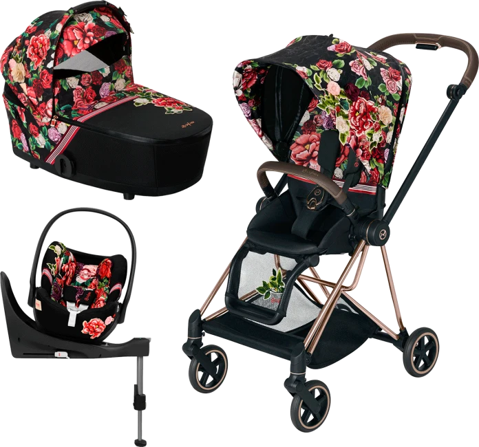 1 x Cybex Mios seat pack including sun canopy, harness padding, comfort inlay and leg rest cover & 1 x Cybex Mios Rose Gold Chassis, 1 x Cybex Mios Carrycot Spring Blossom Light, 1 x Cybex Cloud Z Car Seat