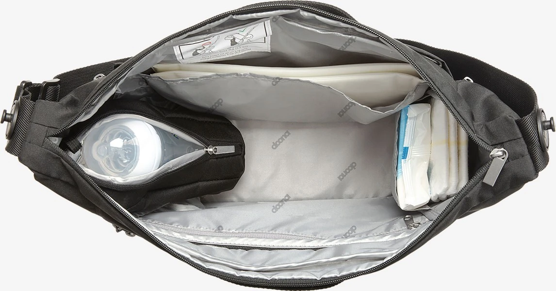 The Doona New Collection All-day clip on bag is designed to complement your Doonaâ„¢ with style, voluminous space and functionally. The bag comes with a matching changing mat, a thermal bottle warmer and practical compartments with multiple zippered openings to allow easy access to all your everyday necessities. With a unique easy clip on system bespoke to the Doonaâ„¢ the All-day bag allows you to be hands free all day long.