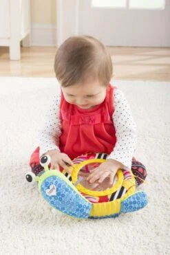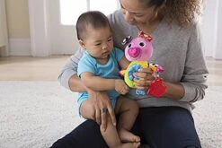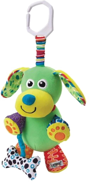 Pet Pupsqueak’s nose to hear him ‘bark’! An electronic sound mechanism plays up to 1,800 times. Baby will also delight in discovering other fun squeaks, crinkles, and rattles. The added link makes him easy to take along anywhere.