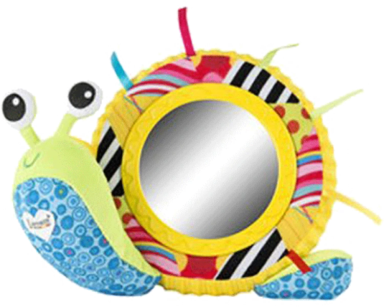 Shelly is a snail with time to entertain, playing tunes and showing your baby the world through her mesmerising illuminated mirror. Safe and shatterproof, the mirror encourages little one to focus and explore the world around. Press anywhere on its surface and it turns from a plain mirror to one that’s magical! She’ll start playing a range of tunes to suit the mood as different characters appear! In daytime mode, she’ll keep baby entertained with three upbeat melodies. At night, there are two soothing lullabies to choose from, perfect to slow the pace. Right around the edge are lovely colours and exciting patterns to discover, as well as tassels baby can chew on. Covered in soft fabric textures, Shelly will comfort baby at night and encourage tactile exploration by day. Ideal for babies from birth upwards.