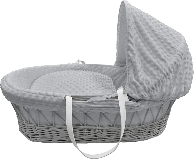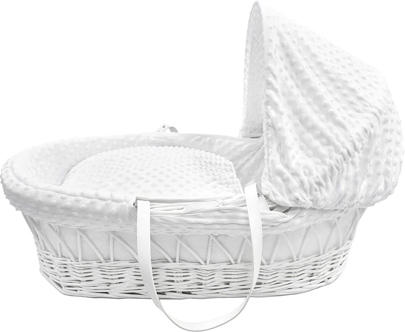 - Gorgeous Moses Wicker basket in White. Providing your precious one a perfect and safe environment. Finished beautifully with a complete matching white dimple popcorn dressing