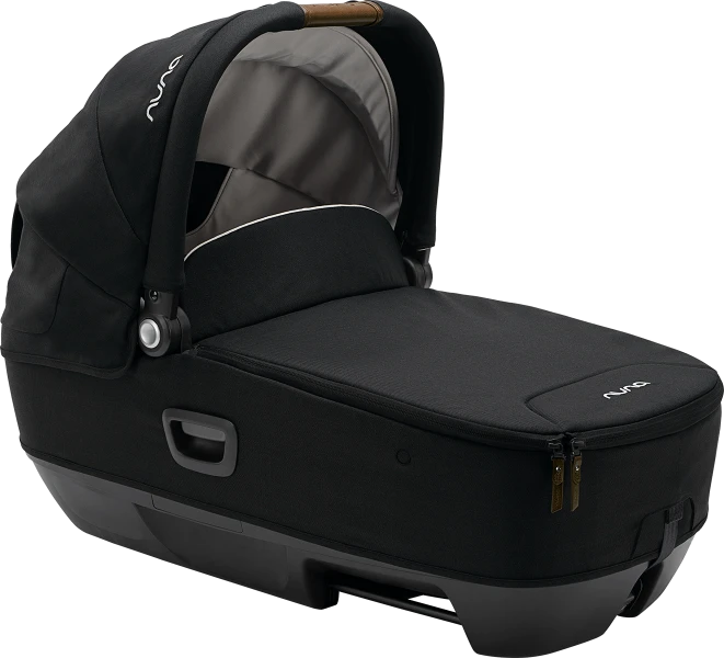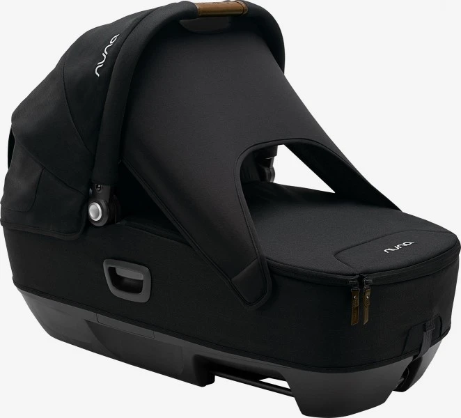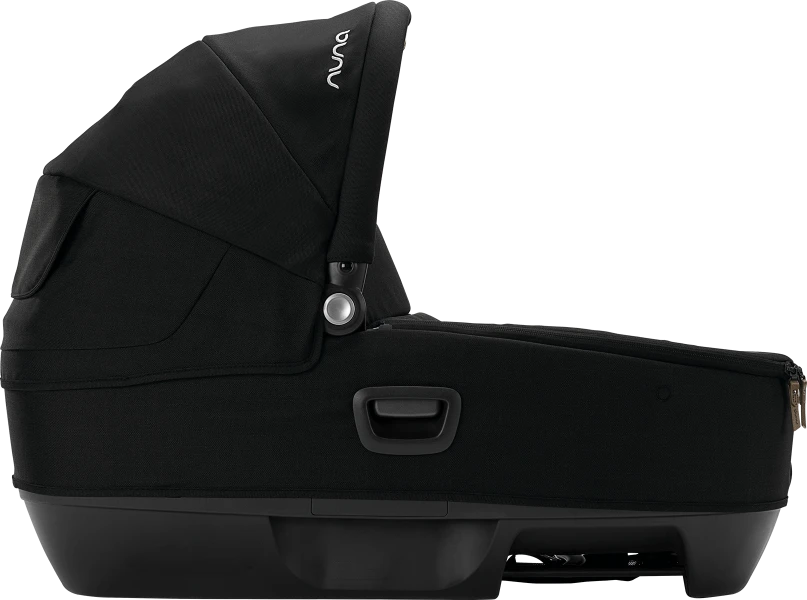 The Nuna CARI NEXT Carrycot Car Seat in Caviar allows baby to lay peacefully at a full recline – the best position for a developing spine.
