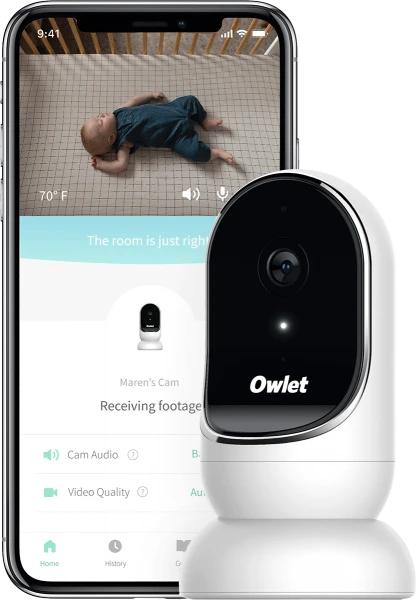 Hear and see your child from anywhere with the Owlet Cam. The high quality video stream can be accessed via the Owlet app, allowing you to check in on your baby wherever you are. With background audio, 2-way audio and night vision, you can enjoy complete peace of mind as your baby sleeps.