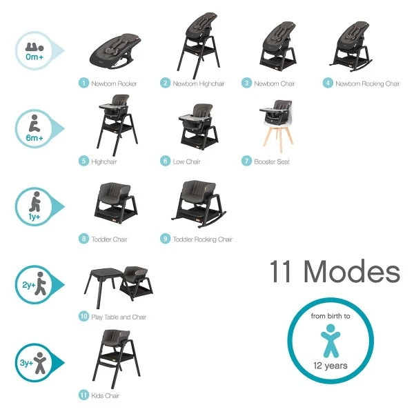 - Can be used in 11 different modes: newborn highchair, newborn rocker, newborn chair, newborn rocking chair, highchair, lowchair, booster seat, toddler chair, rocking chair, kds chair and play table and chair
